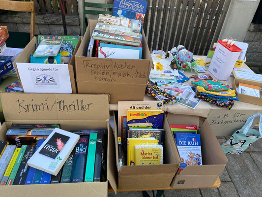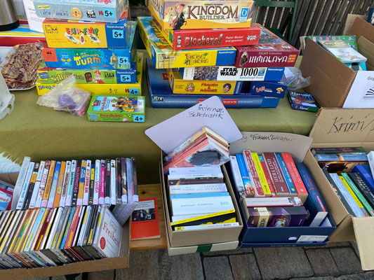 Am 1. April 2023 standen wir wieder vor der Bücherei mit einem reichhaltigen Angebot sowohl aussortierter als auch neuwertiger Medien: Bücher, Comics, Mangas, Hörbücher, DVDs und jede Menge Spiele.